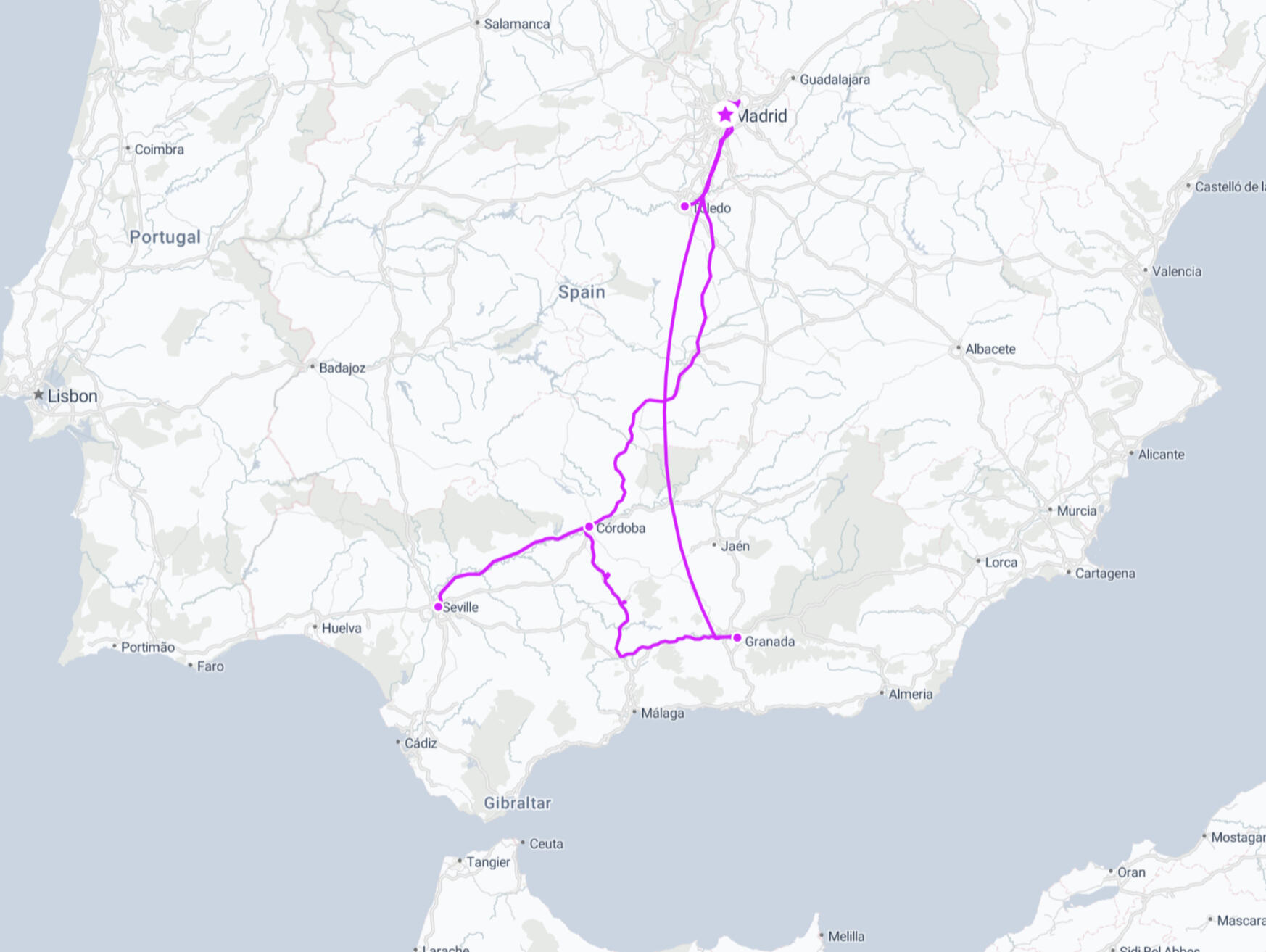 TransportationThere will be a variety of transportation options used on this trip. From local train (Toledo to Madrid) to high-speed train (Madrid to Seville), private transport bus (Cordoba to Grenada) and a domestic flight on Iberia or similar (Grenada to Toledo). All of this will be covered and booked ahead of time, which is one of the reasons advanced bookings are necessary.